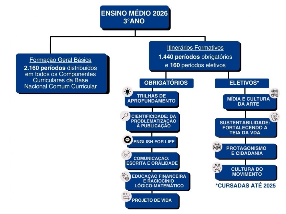 No Ensino Médio, os processos avaliativos fundamentam-se nas habilidades e competências, tanto cognitivas, comunicativas, como socioemocionais, desenvolvidas de acordo com cada Área do Conhecimento: Linguagens, Ciências da Natureza, Ciências Humanas, Ensino Religioso e Matemática especificando os Componentes Curriculares, Formação Geral Básica, Itinerário Formativo Obrigatório e Itinerário Formativo Eletivo relativos às áreas.